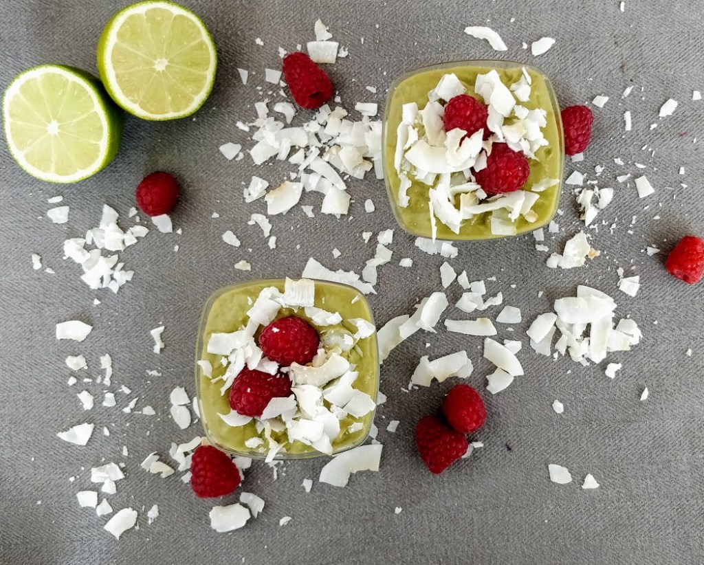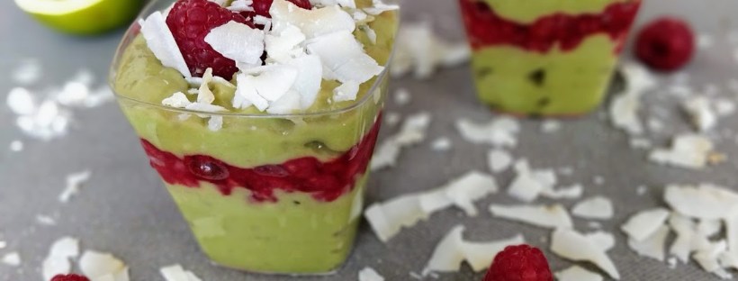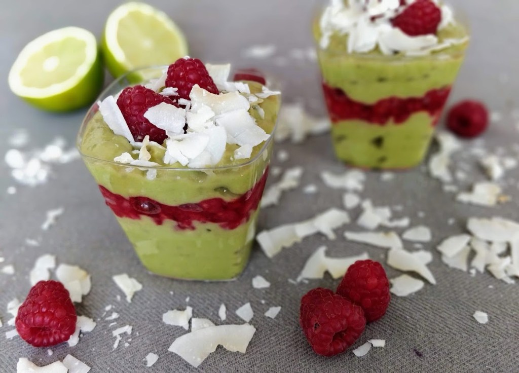 Na spodok servírovacích pohárikov si dáme avokádový puding potom vrstvu malinového pyré a zase vrstvu pudingu. Môžete vrstviť podľa vlastných predstáv (kľudne aj desať poschodí :D). Ak nieste raw alebo vegan alebo gluten free tak si môžete dopriať aj vrstvu z rozdrvených sušienok 🙂 Je to na vašej fantázii. Tak isto aj zdobenie. Ja som použila kokos a celé maliny.